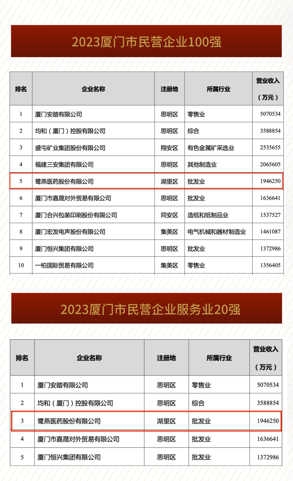 2023廈門企業(yè)百強揭曉,鷺燕醫(yī)藥榮列第16位!