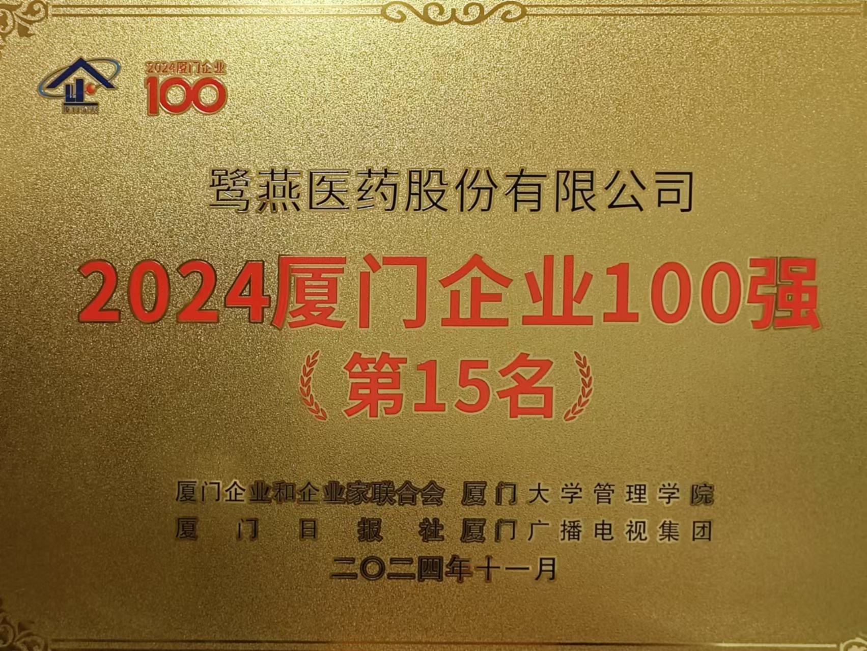 2024年11月,廈門企業(yè)和企業(yè)家聯(lián)合會(huì)發(fā)布2024廈門企業(yè)百強(qiáng)榜單,鷺燕醫(yī)藥股份有限公司榮列第15位!