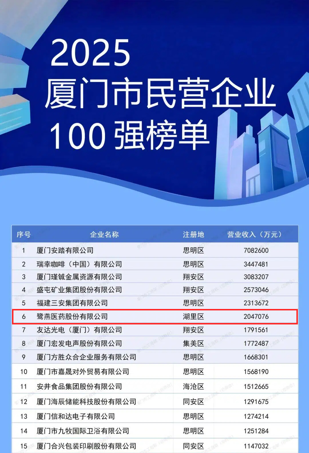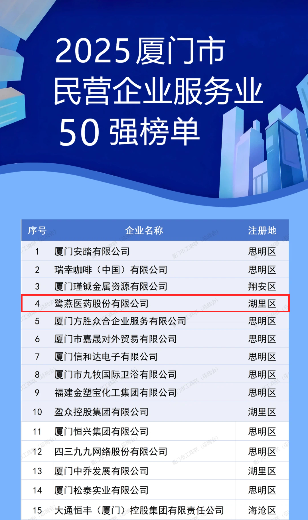 11月1日上午,2025年廈門企業(yè)家日大會(huì)召開(kāi)。大會(huì)發(fā)布了2025廈門市民營(yíng)企業(yè)100強(qiáng)系列榜單,介紹了廈門市民營(yíng)經(jīng)濟(jì)發(fā)展態(tài)勢(shì)和營(yíng)商環(huán)境建設(shè)成效。鷺燕醫(yī)藥股份有限公司憑借上市企業(yè)綜合實(shí)力,榮膺“2025廈門市民營(yíng)企業(yè)100強(qiáng)”第6位,以及“2025廈門市民營(yíng)企業(yè)服務(wù)業(yè)50強(qiáng)”第4位。